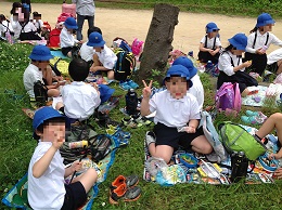 青空の下,みんなで食べるお弁当はとてもおいしかったです♪