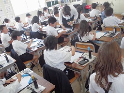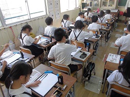 3年生の参観の様子と学年の掲示板です。書写「筆で書いてみよう」という学習でした。初めて使う筆で縦画やぐるぐる線などを書きました。使い方や片づけ方など,これから続けていく中で身につくはずです。次に書く,最初の文字が楽しみです。