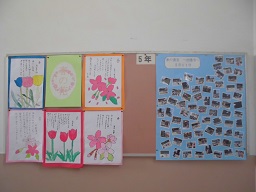 学年掲示板には,季節の花を描いた絵と遠足の写真が掲示されています。毎月取り組む季節の花詩も添えられています。花の色を丁寧に塗り,また絵に合う詩も素敵です。来校された際には,ご覧になってください。