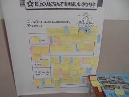 今月の生活目標は「よい言葉づかいをしよう」です。各学級では,それぞれ学級指導や道徳,生活科,総合的な学習などで生活目標に関わるような取り組みをしています。この掲示物には,年上の人への話し方を子どもたちが付箋に書いて貼っていきます。特に低学年の子どもたちにとっては,小学校は年上の人たちばかりです。自分で考え,実践することで身につくことは多いと思います。