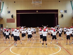 ラジオ体操は,運動会の開会式の後,全校で行います。きちんと最後までやると汗が出るくらいの運動です。低学年にとっては,ピシッと動きを止めたり,次の運動へつなぐ動きをしたりするのが難しいと思いますが,しっかり取り組めていたと思います。