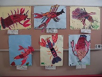 6月に本校記念の森にある池でザリガニ釣りをした2年生。教室前の廊下で大切に育てています。ザリガニには特徴的な大きなはさみがあり,画用紙からはみ出るくらい迫力のある絵もあって,よく見て描けています。
