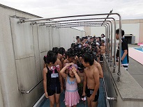 大きなプールに入るのに最初は緊張していた様子でしたが,5.6年生が優しく声をかけ,一緒に入ることで緊張もほぐれて楽しい時間となったようです。