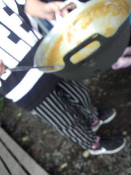 かまどで炊いた鍋や飯ごうはすすで真っ黒です。