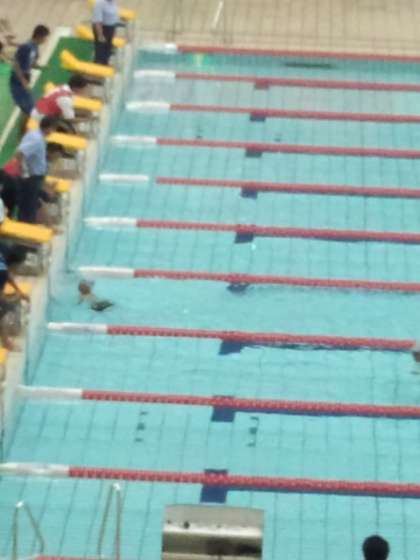 平泳ぎは五年以下男子の部が行われています。中本小学校からは二名が出場しています。ここまでプログラムは予定通り進んでいます。