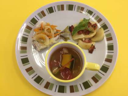 メニューは「あじのマリネ」「夏野菜のさっぱりスープ」「じゃがいものバジル焼き」です。子どもたちはみな協力して楽しそうに調理していました。自分たちが考えたものが形となり,しかも「美味しかった」ので,嬉しかったのだと思います。どのように評価されるかはわかりませんが,素晴らしい経験になったと思います。