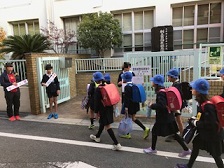 朝の登校時に児童会が正門に立って,集団登校の子どもたちと挨拶を交わします。普段,見守り隊の方々や友だち同士でも挨拶ができていなかったり,声が小さかったりする子にもしっかり挨拶をしてもらうように強調週間としています。