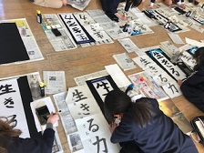 事前に文字の形やバランスなどについて学び,書初めがスタートしました。最後まで頑張って取り組めていました。来年はまた一段と達筆になっているでしょうね。