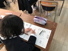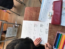 2年生は硬筆です。書初めの意味や文字のバランスを考え,お手本をよく見ながら視写していきました。「新しい年」と文章を頑張って書くことができました。