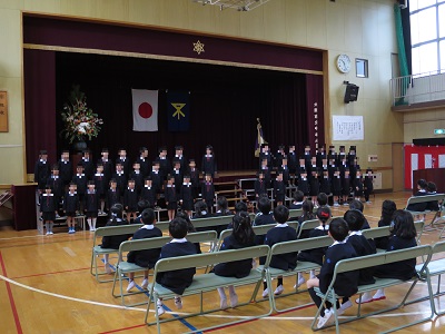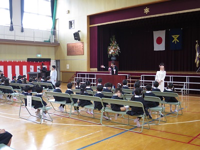 式の最後には2年生が歓迎の演技を披露してくれました。中本小学校の校歌を歌ったり,楽しい学校生活について紹介してくれたりしました。1年生は楽しそうに見ていました。