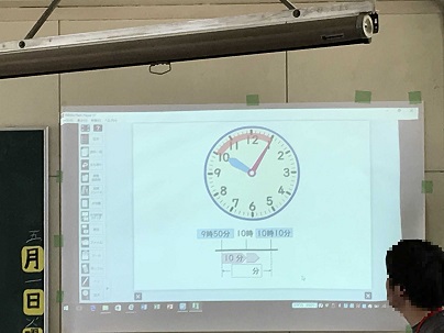 3年生の算数の授業中,スクリーンにデジタル教材を投影して時間の学習を進めていました。デジタル教材のよさは,カラーであり,立体的に見ることができたり,動かして確認したりすることができるところです。