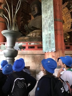 昼食後の東大寺見学では観光客や修学旅行生がかなりたくさんいる中,列をつくってきちんとり移動し,大きな大仏を見て歓声を上げていました。