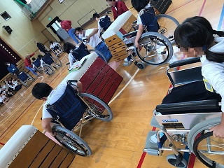 体験活動では,講堂に設置したコースを自走して回り,段差や障害物を越えていく難しさを感じることができました。また,友だちを乗せて廊下や運動場に作ったコースを押して回りました。押し方が強かったり,間違っていたりすると,乗っている人は不安になります。また,手順通りにしないと押せません。実際に体験したからこそ気づくことができました。