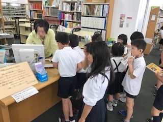 図書館見学の後半には一人1冊ずつ本を借りる時間がありました。子どもたちの中にはたくさんある本の中から1冊を選ぶのに悩んだ子もいましたが,嬉しそうに本を探していました。借りた本は後日まとめて学校へ送ってもらいます。