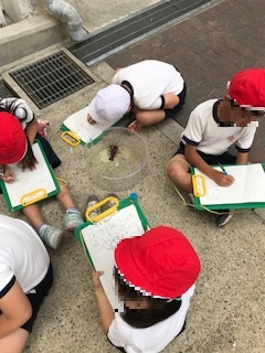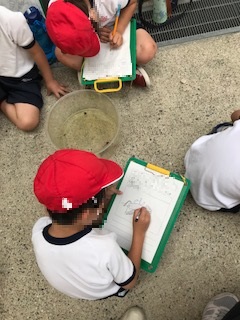 ザリガニ釣りの後には,観察シートに,観察して分かったことを絵に描いてみたり,言葉や文章で書いたりしました。