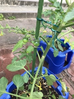 下の画像は2年生一人一人の鉢で育てている「ミニトマト」です。小さな黄色い花が咲いている中で,まだ緑色ですが実ができていました。