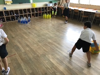 10班…「ボウリング」(学習室1で行いました。ペットボトルをピンに見立てて,ボールを転がして倒していくゲームです)