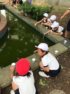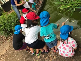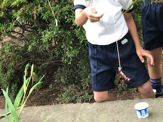 この日は北中本保育園のお友だちも参加して,ザリガニ釣りを一緒に楽しみました。お兄ちゃんお姉ちゃんとして,挨拶もしっかりでき,釣りの最中も声をかけるなどがんばりました!!