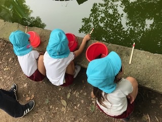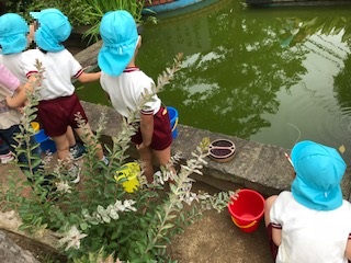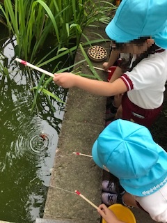 本日,3時限目から4時限目にあたる時間に,北中道幼稚園の年長さんたちがザリガニ釣りをしました。