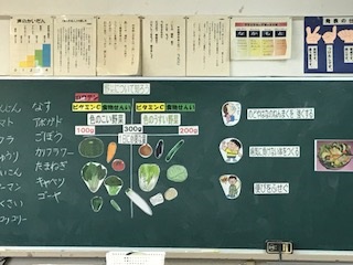 テーマは「野菜について知ろう」です。毎日必ず食べている野菜ですが,「色の濃い野菜」「色の薄い野菜」があったり,栄養素であったりと,意外と子どもたちが知らないことがありました。また,5年生の子どもたちであれば,1日に必要な野菜の量は「300g」だそうです。なかなかこの量を食べるのは難しいと思いますが,できるだけたくさんの野菜を食べられるようにご家庭でもご協力をお願いします。