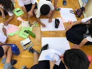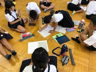 5時限目に多目的室で5.6年生がマリンスクールで行う,「キャンプファイヤー」のスタンツ練習・打合せをしていました。