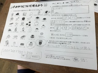 子どもたちにとって楽しみの一つである「おやつ」ですが,1日に200キロカロリーまでとされています。自分たちの普段のおやつを振り返りながらどのくらいのカロリーを摂取しているのか,おやつを食べることのよさ,などについて考えました。