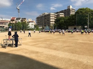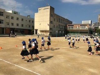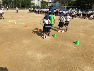 活動内容は「フラフープリレー」で,二人一組をつくって,フラフープに入り,コーンを回っていきます。高学年の子は低学年の走る速さに合わせながら走っていました。また,笑顔もたくさん見られました。児童集会はコミュニケーション能力を高めたり,関係性を深めたりするためにも,大切な活動です。これからの集会活動も楽しみです!!