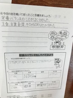 自分が食べてきた朝食に「主食・主菜・副菜・その他」が入っているのかを調べました。好きなものだけを食べるのではなく,バランスを考えた食事をとることが大切です。給食は必ず「主食・主菜・副菜・その他」がバランスよく入っています。子どもたちは給食のよさを知り,バランスのとれた献立になるように考えていました。
