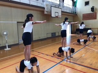 いよいよ難易度が上がってきた,5.6年生の団体演技です。練習を重ね,友だちを信頼し,本番に向けてがんばってほしいと思います!