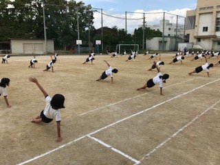 4時限目,5時限目は5.6年生が運動場で練習を行いました。これまでは体育館で組立体操の技を練習したり,ダンス部分に取り組んだりしてきました。
