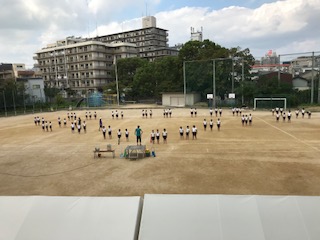 今日初めて運動場に出て,隊形を確認しました。移動が多いのも高学年ならではです。技の難しさに隊形の美しさ,何より一生懸命に取り組む姿が感動的な演技です。今日は初めての運動場での練習でしたが,一人一人がしっかり目標をもって,取り組んでいました。
