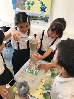 実験用の道具などは小さいものですが,実際の浄水場の仕組みと同じ流れです。子どもたちは自分の役割を果たしながら,水がきれいになっていくのを見て,驚いていました。