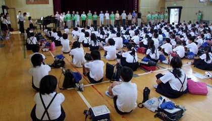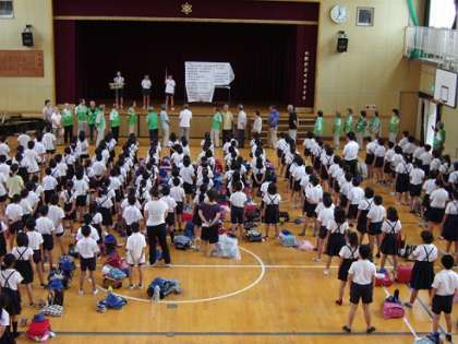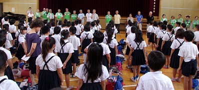 前日の児童集会では、各学級で練習している歌『にじ』を全校児童で練習もしました。