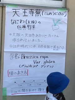 学習参観があった26日の午前中,3年生が学習園で種蒔きをしていました。蒔いていたのは「天王寺蕪」です。大阪の伝統野菜の一つです。種蒔きのときには,管理作業員さんに「天王寺蕪」について教えてもらいました。