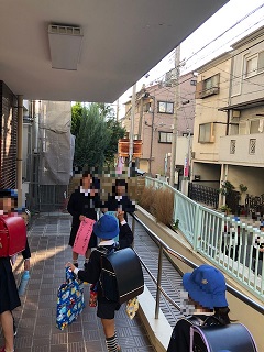 「朝ごはんを食べよう」「よくかんで食べよう」と,登校している子どもたちへ呼びかけていました。