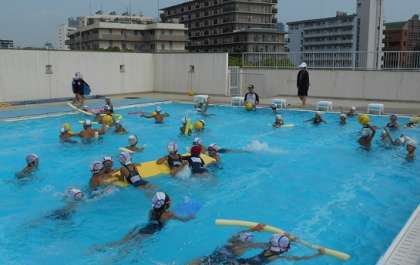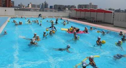 毎日120名前後の児童が参加しています。普段の授業では使用しない道具や滑り台に子どもたちは歓声をあげて楽しんでいます。水の中でたくさん動くことで体力アップにもつながっています。