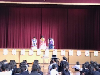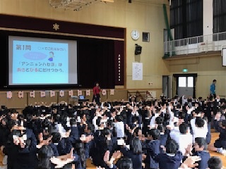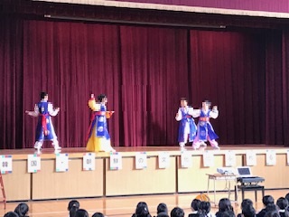 毎週火曜日6時限目に活動しているクムモイム(国際クラブ)に参加している児童による踊り,クムモイムを指導してくださるソンセンニムによるクイズをみんなで楽しみました。