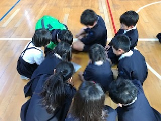 講堂の舞台上の幕を少しだけ開けたところに物が通ります。それがいったい何なのかをなかよし班で話し合って答えるクイズです。一瞬のことなので,難しい問題もありましたが,低学年の子どもたちも自分の考えたことを出しながら,楽しそうに活動できました。