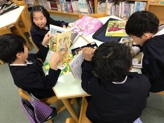 子どもたちは自分が借りる本を探します。たくさんの蔵書の中から,本を探すのが楽しそうです!