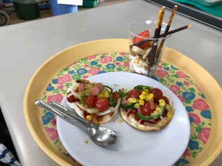 2月25日に,5年生が「食生活改善推進員協議会」の方々と一緒に調理実習を行いました。メニューは給食前ということもあって,ピザとパフェでしたが,手のひらサイズのピザ2枚とパフェにお腹いっぱいになった子もいたようです。