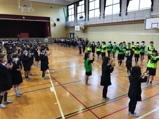 昨日は児童集会の日でした。いつもと同じようになかよし班で並んで,さあスタート…。あれ!!いつも先頭と最後尾にいるはずの6年生がいない!!
