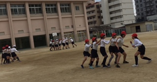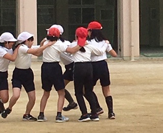 運動場では5年生が体育をしていました。笑顔いっぱいで体を動かし、汗だくになっていました。