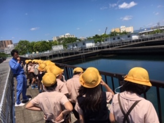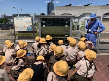 部屋の中での実験の後は水道局の方の案内で、クラスごとに甲子園球場13個分に当たる場内を見学しました。淀川から引き込まれた水が200以上にもなる検査を経て、美味しい水道水になることを教えていただきました。