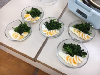 「ゆでてみよう」という単元で、卵とほうれん草をゆでて、ドレッシングやお塩でいただきました。