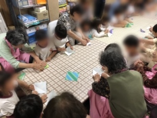 そらぐみが2回目の憩いの家に訪問しました。今歌っている「そらとべあおむしくん」を歌ったり、「むしむしじゃんけん」をしてふれあいを楽しんだりしました。その後、カタツムリの折り紙を教わり、楽しい時間を過ごしました!