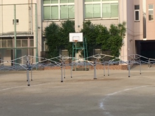 放課後、児童用テントを準備しました。管理作業員さんが作っていた紅白のプラカードも出来上がっています。
