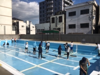 昨日、教職員でプール清掃の仕上げを行いました。プールサイドもプールの壁面もピカピカに磨き上げられ、後は子供達が元気よく水泳学習をしてくれるだけです。