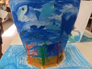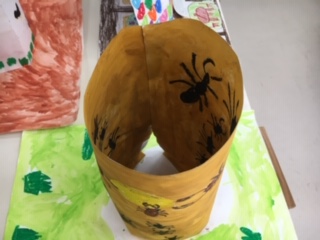 3年生の一クラスが図工室で鑑賞会をしていました。正面だけでなく、表も裏も、煙突やトンネルのようになった所にも絵が描かれていて、それぞれの世界が広がっていました。描くことも、友達の絵を見ることもすごく楽しかったようです。