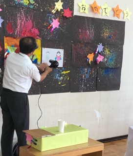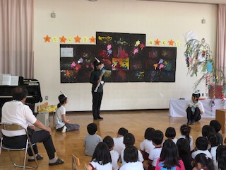 7月の誕生会は、七夕の集いと共にお祝いしました。園長先生からのお祝いは、絵が消えたり浮き出たりする不思議なマジックでした。また、先生たちの七夕の劇もあり、子どもたちは、楽しい時間を過ごしました!