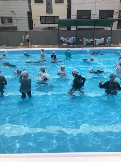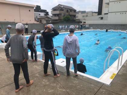 夏休みなど、川や海に遊びに行く機会があるかもしれません。もし溺れてしまったときや足をつってしまったときなどは泳がずに浮くことが大事です。衣服を着たまま25mを泳いでみてどれだけ泳ぎにくいかを体験し、その後ペットボトルを使用して浮く練習をしました。